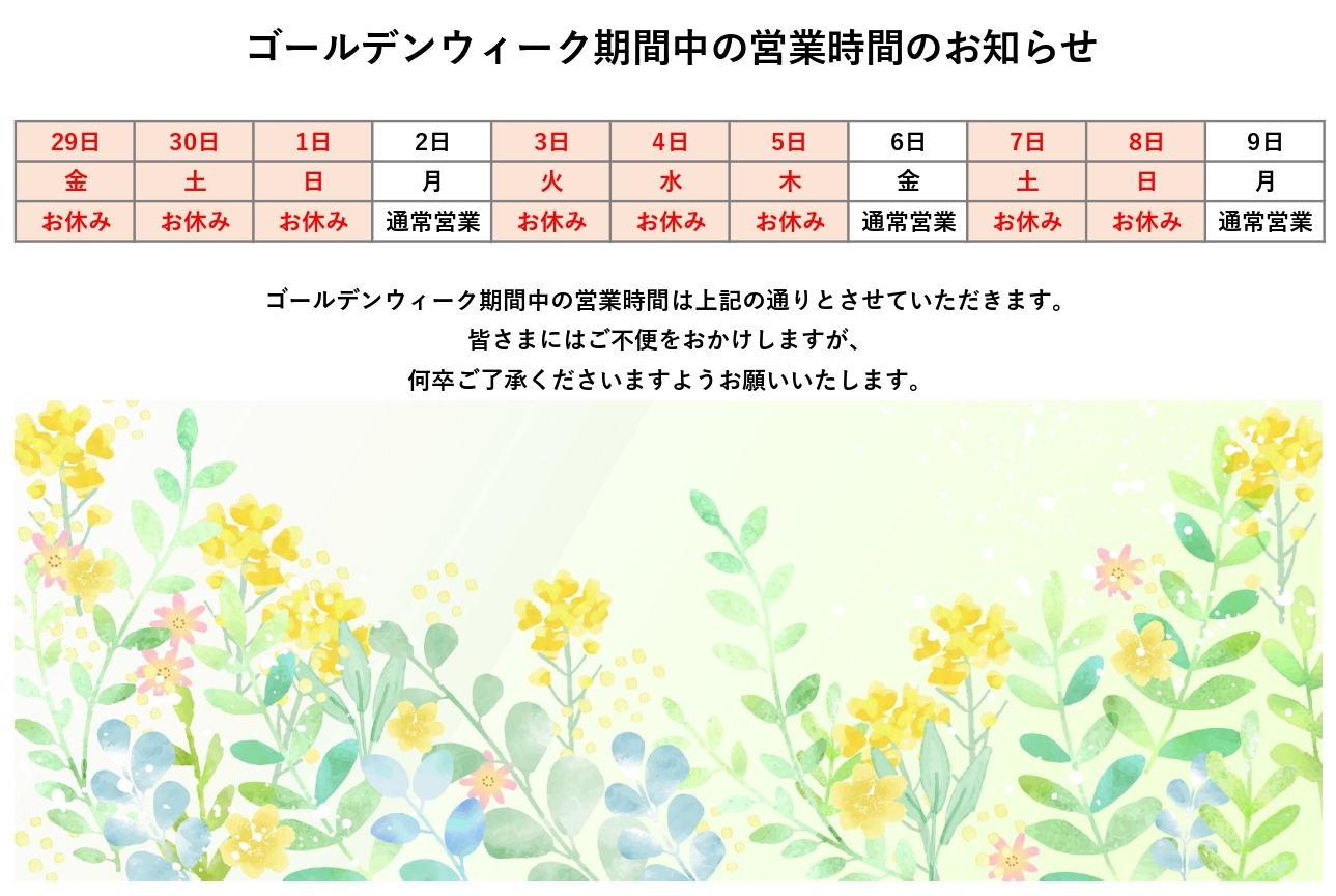ゴールデンウィーク期間中の営業時間のお知らせ